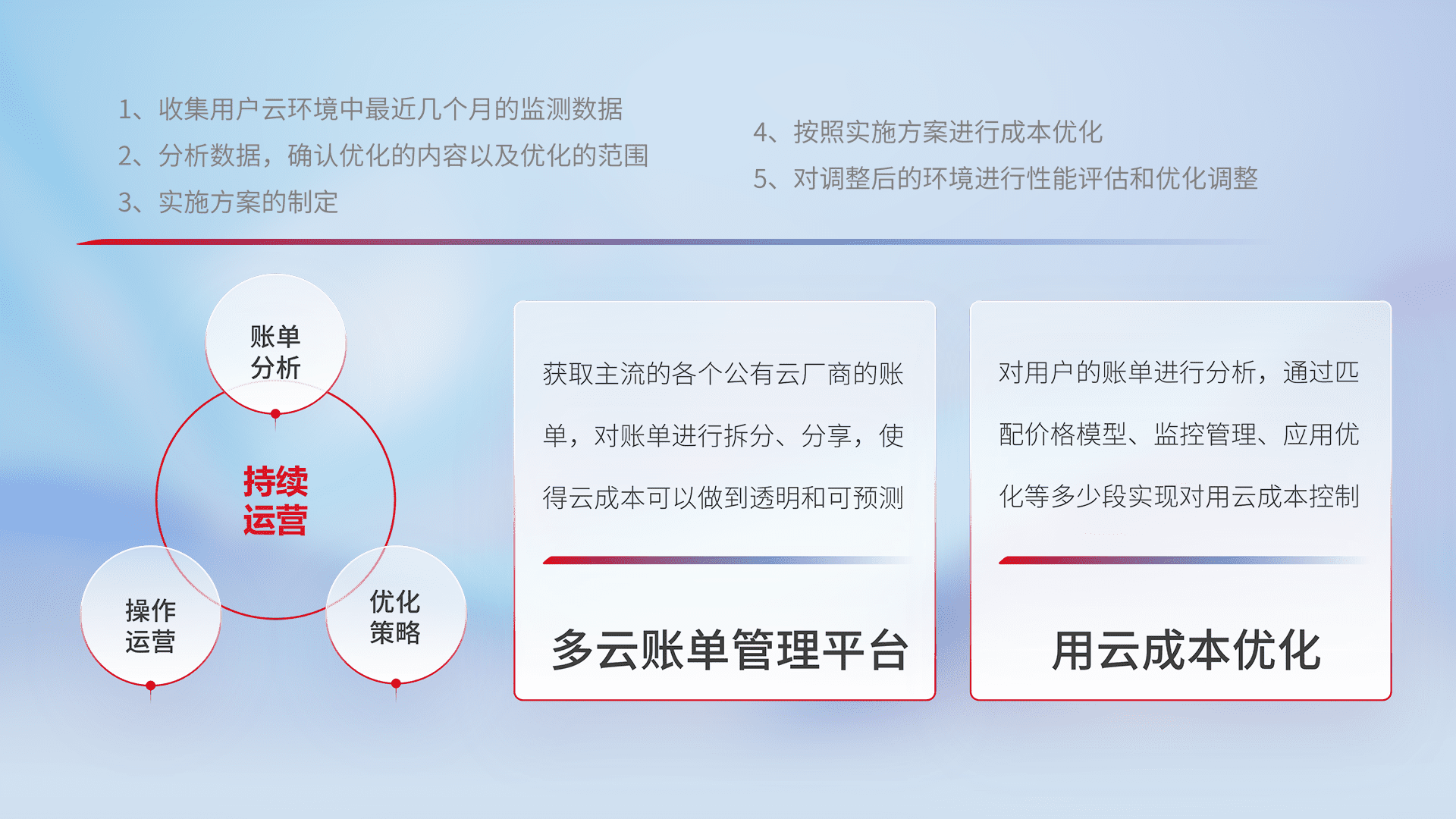 通过多云纳管,,,以统一的资源数据模型把客户的云资源进行抽象和封装,,,,进而实现对多云资源的统一操作,,,保障云资源管理的可靠性、、、、稳定性与可用性。。。。量身定制化运维内容,,,配置、、、、开发运维、、、、补丁管理、、、、备份、、监控、、认证和访问管理、、、审计和日常巡检等,,,,保障在用云过程中的可靠度,,,,稳定度以及高可用率。。